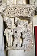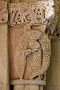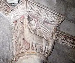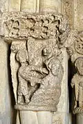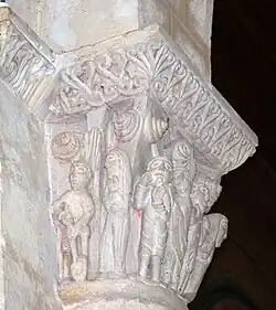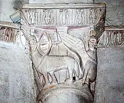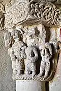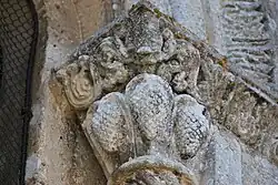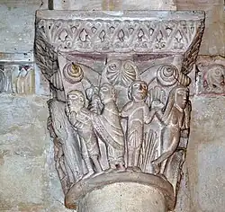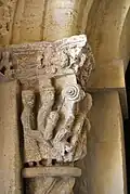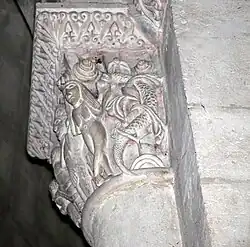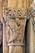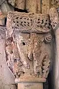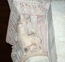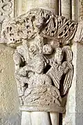 Six chapiteaux romans, dont deux sont historiés, soutiennent la corniche. Du sud au nord : feuillage d'acanthes, lions et dompteurs, acanthes, les quatre dogues, pignes, acanthes.