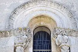 Les sculptures romanes existantes à l'extérieur sont six chapiteaux au portail occidental, huit colonnes et chapiteaux autour du chevet, trois fenêtres et leurs colonnettes dans l'abside et les modillons qui soutiennent la corniche du chevet.