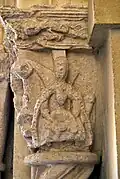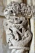 Le tailloir du chapiteau est orné d'une frise d'acanthe sèche. Sur la face principale de la corbeille, un ange nimbé est grimpé sur le dos d'un dragon ailé symbolisant le Diable. L'ange aux pieds nus enfonce un épieu dans la gueule du dragon.