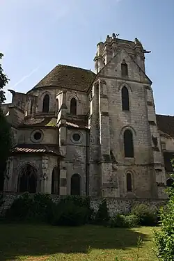 Les chevets à pans coupés des cinq chapelles rayonnantes sont une bonne illustration du style flamboyant, avec notamment des contreforts décorés de pinacles garnis de crochets. Les baies des extrémités, plus larges que les autres, sont les seules à posséder un remplage. Il se compose de deux lancettes, surmontées de soufflets et mouchettes. Les oculi en dessus des chapelles rayonnantes, toutes refaites à l'époque moderne, n'éclairent pas le déambulatoire mais les tribunes du chœur. Les murs du chœur sont consolidés par six arcs-boutants dans la prolongation des contreforts du déambulatoire. Ces arcs-boutants en quart-de-cercle ont été rajoutés au XIIIe siècle, et leurs gargouilles variées indiquent bien cette époque. Au-dessus des arcs-boutants, les contreforts plats d'origine subsistent. Les arcs-boutants secondaires avec leurs ouvertures rectangulaires sont susceptibles d'être modernes, mais échappent à une datation exacte. Sous les combles, ils reposent sur de véritables arcs-boutants intérieurs, dont les rampants servent en même temps d'appui à la charpente de la toiture. Des arcs de décharge au-dessus des oculi des tribunes relient les contreforts internes entre eux et renforcent ainsi la structure. Pour Eugène Lefèvre-Pontalis, cette disposition résulte d'une reprise à l'époque moderne, alors que Maryse Bideault et Claudine Lautier ont identifié le même système de contrebutement dans la collégiale détruite Saint-Évremont de Creil (connue par un article de Lefèvre-Pontalis...), et dans les tribunes du chevet de Saint-Germer-de-Fly. Entre les arcs-boutants, les fenêtres hautes du chœur sont des lancettes simples en tiers-point, décorées par des cordons d'étoiles retombant sur des têtes grimaçantes. La corniche à hauteur des seuils des fenêtres est entièrement refaite. En haut du mur, l'on retrouve une fois de plus une corniche de têtes grimaçantes, dont certaines manquent aujourd'hui[37],[38].