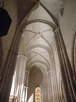 À l'exception des fenêtres de la nef et des bas-côtés, l'arc en tiers-point règne partout dans la nef et les bas-côtés : Ceci vaut pour les grandes arcades, pour les doubleaux, pour les formerets et pour les ogives. Comme déjà observé, les grandes arcades et les doubleaux sont analogues, et ils sont tous à double rouleau. Le rouleau supérieur est mouluré d'un tore dégagé ; le rouleau inférieur est au profil d'un méplat entre deux tores dégagés. Par l'intermédiaire des tailloirs carrés des chapiteaux, il retombe sur des colonnes à moitié engagées dans les piliers à noyau cruciforme. Les colonnes engagées s'accompagnent des fines colonnettes des rouleaux supérieurs, qui encadrent la colonnette correspondant à l'ogive. Toutes ces colonnettes sont logées dans des ressauts du pilier. La colonnette des ogives a son tailloir planté de biais, face aux ogives. Ainsi les piliers de la nef sont cantonnés de quatre colonnes et de douze colonnettes. Ce nombre déjà considérable explique sans doute que le maître d'œuvre a préféré faire retomber les formerets sur des culs-de-lampe, car les piliers fasciculés sont déjà assez massifs. Par ailleurs, des colonnettes supplémentaires auraient rompu la symétrie, car il n'y en aurait pas eu besoin dans les bas-côtés, où les rouleaux supérieurs tiennent en même temps lieu de formerets (sauf au droit des murs extérieurs, dont il n'y a pas question ici). Afin de rester fidèle au principe appliqué au niveau des doubleaux, les formerets retombent également sur des têtes grimaçantes dans les angles au revers de la façade ; ici, deux têtes grimaçantes flanquent donc un chapiteau unique, réservé à l'ogive. Les ogives sont au profil de deux tores séparés d'une gorge, qui est ornée d'étoiles ou de pointes-de-diamant. C'est un principe décoratif répandu dans l'ouest de la France, mais qui se trouve également sur certaines voûtes de l'église du prieuré Saint-Martin-des-Champs ; de l'abbatiale de Saint-Germer-de-Fly ; et de la cathédrale Notre-Dame de Noyon[16],[17],[18] ; ainsi que dans le sanctuaire de Bonneuil-en-Valois.