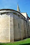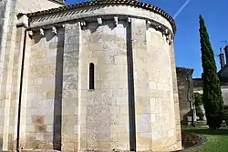 L'abside semi-circulaire de l’église comporte une voûte en berceau. Celle-ci repose sur une corniche à damier, qui repose sur des modillons figurés. Au-dessous, sept arcatures appliquées en plein cintre retombent sur des colonnes aux chapiteaux décorés de stries et de tiges entrelacées.