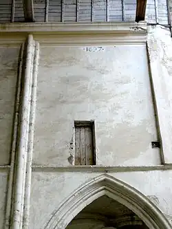 De même, un peu partout, des parties défectueuses du parement ont été refaits avec de petits blocs cubiques de grès[7],[11],[12]. L'année 1697 est inscrit en dessous de la corniche de plâtre, en haut de la quatrième travée côté nord.