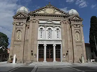 Les travaux de construction de l'église commencent dans les années 1850 et s'achèvent en 1935. Les plans du bâtiment sont réalisés par l'architecte local Argýris Adalís, disciple d'Ernst Ziller, qui aide ce dernier dans ses projets de construction à Athènes. L'église est dédiée à Saint Thérapon[1],[2].