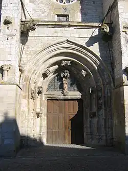 L'élément le plus remarquable de cette église est la tour occidentale dont le rez-de-chaussée fait office de porche, ouvrant sur une nef de quatre travées. Elle a été construite au XVIe siècle et les angles de cette tour sont consolidés par de puissants contreforts. Cette tour-porche s'ouvre par un portail surmonté d'une balustrade et d'une rosace. Les voussures du portail ont cependant souffert[1].