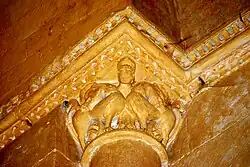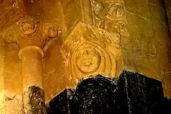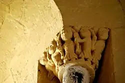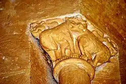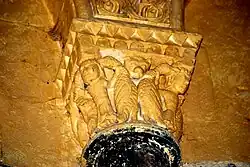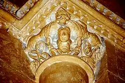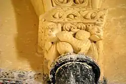 Les chapiteaux de la fenêtre sont sculptés avec un lion bicorporé à l'est et deux lions adossés à l'ouest. La sculpture du chapiteau de l'arcature occidentale est symétrique. Au centre de la face principale, un masque de démon. Sous le masque, deux énormes volatiles sont dos-à-dos. Sur chaque angle de la corbeille, un homme debout, habillé d'une tunique longue, a saisi le cou de l'oiseau qui lui picore l'oreille. Sur chacune des petites faces se trouve un autre oiseau, avec son cou saisi par l'autre main de l'homme.