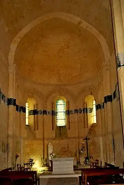 Les deux colonnes de l'arc triomphal portent chacune un chapiteau bifacial historié. L'abside, voûtée en cul-de-four, est éclairée par cinq fenêtrages en plein-cintre. Chaque fenêtre est cantonnée par des colonnettes à chapiteaux sculptés. Les fenêtres sont surmontées par une arcature dont les colonnes, qui montent du sol, sont terminées par des chapiteaux bien exécutés.