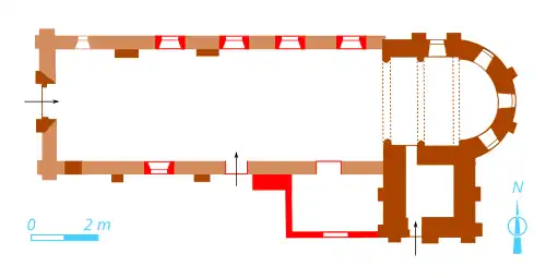 Mur sud de la nef montrant des traces de surélévation.