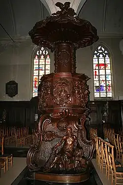La chaire à prêcher porte la date de 1755. Elle a pu être commandée en 1753 grâce à un don de Judoc Coppens, seigneur de Hondschoote. Elle a été réalisée par Jean Elschoocq, sculpteur, et Josept Roose, ébéniste à Bergues.