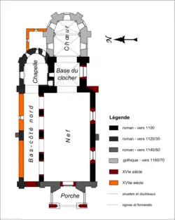 À peu près régulièrement orientée, l'église répond à un plan devenu dissymétrique depuis la deuxième campagne de construction des années 1120 / 1130, qui a porté sur l'adjonction d'un bas-côté et d'une chapelle au nord seulement. L'église se compose ainsi d'une nef non voûtée de quatre travées ; d'un étroit bas-côté nord simplement plafonné ; d'une base de clocher servant de première travée du chœur et voûtée d'ogives ; d'une seconde travée du chœur droite suivie d'une abside en hémicycle, également voûtées d'ogives ; d'une chapelle voûtée en berceau, l'abside voûtée en cul-de-four dans l'angle entre bas-côté nord et clocher ; et d'une sacristie moderne dans l'angle entre cette chapelle et la seconde travée du chœur. Le clocher est coiffé d'une flèche en pierre. Seule la façade occidentale est dominée par un pignon ; s'y trouve aussi l'unique portail que possède l'église. Il est précédé par un porche.