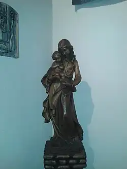 Posée sur un support en bois, près du chœur, côté aval de l'édifice, sous la tapisserie christologique, il y a une très simple Vierge à l'Enfant en bois devant laquelle un petit meuble en fer forgé permet aux fidèles de faire brûler des petits cierges, c'est-à-dire, pour les catholiques, des prières qui montent vers Dieu par l'intercession de Marie. Sur le socle de la statue, dans son dos, elle porte l'inscription suivante qui est la signature du sculpteur : « Businelliø. 85 ».