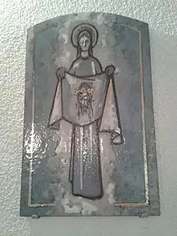 Dans l'église catholique d'Ollon[69], sur le côté droit du chœur (côté amont), se trouve une tapisserie qui présente plusieurs symboles liés à Marie mais qui doivent toujours être mis en lien avec son fils Jésus[70]. Au centre de la tenture, entourés de flammes qui manifestent l'appartenance au divin au même titre qu'une auréole placée sur la tête d'un saint, se trouvent deux éléments. Tout d'abord, les initiales de Marie, à savoir un M et un A enchevêtrés. Il pourrait aussi s'agir de la première lettre des deux mots de l'Ave Maria. Ensuite, le dessin d'un cœur surmonté d'une croix. Ce symbole renvoie à la dévotion catholique au Sacré-Cœur de Jésus. Cette fête est née dans l'église dès le XIIe siècle mais elle se développe principalement au XVIIe siècle à la suite des apparitions du cœur de Jésus à une religieuse française, Sainte Marguerite-Marie Alacoque (1647-1690). Popularisée en France par cette sainte bourguignonne et par Saint Jean Eudes, le pape Clément XIII institue en France la fête du Sacré-Cœur de Jésus en 1765. En 1856, la pape Pie IX l'étend à toute l'église catholique. Cette fête est célébrée, un vendredi, 19 jours après la Pentecôte[71]. Le lendemain de cette fête, le samedi, est célébrée la fête du Cœur immaculé de Marie. Popularisée elle aussi au XVIIe siècle par Saint Jean Eude (1601-1680), elle se développe en parallèle de l'essor de la dévotion au Sacré-cœur de Jésus. Le Cœur immaculé de Marie renvoie à la foi de la Vierge qui gardait dans son cœur tous les événements de la vie de Jésus et les méditait[72]. Le , le pape François a consacré le monde au Cœur immaculé de Marie en proposant ainsi la foi de Marie comme modèle et guide pour les croyants.