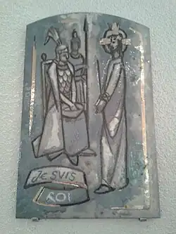 Le troisième symbole est celui du bas de la tenture, soit un glaive et une palme. Ces deux images renvoient directement au martyre de Jésus à la Croix. Pour les chrétiens, à la Croix, Jésus qui donne sa vie pour les hommes et les femmes pécheurs. Renvoyant à l'entrée triomphale de Jésus dans Jérusalem juste avant sa Passion et sa mort sur la Croix[63], l'image des palmes se retrouve d'ailleurs très souvent dans les tableaux ou représentations des saints et saintes martyrs, martyr signifiant témoin. Le glaive rappelle aussi le jugement dernier puisque le Christ sera, à la fin des temps[64], à la fois le juge et l'avocat des hommes[65] car, pour les chrétiens, Jésus n'est pas d'abord venu pour juger le monde mais pour le sauver[66].