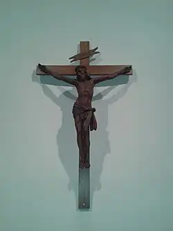 Dans le chœur de l'église, un crucifix en bois est accroché au mur. Il s'agit d'un Christ souffrant qui porte une couronne d'épines et une sorte de linge ou de pagne qui, dans l'église catholique, cache la nudité de Jésus sur les représentations de crucifixion. En effet, le Nouveau Testament précise que les soldats se sont partagé les habits du Christ, dont sa tunique[104]. Jésus ne devait donc plus porter de vêtements au moment d'être crucifié. De plus, l'archéologie et les textes de l'Antiquité semblent attester que les crucifiés étaient généralement mis au supplice nus. C'est pourquoi, dès le XIe siècle, un consensus se dégage pour représenter Jésus pudiquement habillé d'une sorte de linge, le perizomium.