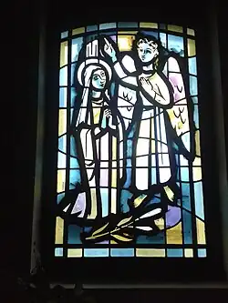Ce premier vitrail[37] représente l’Annonciation faite à Marie par l'archange Gabriel[38]. Il s'agit du moment où Dieu envoie Gabriel comme messager, auprès de la jeune Marie afin de lui demander de devenir la mère du Sauveur annoncé par les prophètes, la mère de Jésus[39]. À cette demande, Marie s'interroge car elle est vierge mais l'ange lui dit : « L'Esprit Saint viendra sur toi et la présence du Très-Haut te prendra sous son ombre; c'est pourquoi celui qui va naître sera saint, il sera appelé Fils de Dieu ». Marie lui répond : « Voici la servante du Seigneur; qu'il me soit fait selon ta parole ». La tradition catholique parle du Fiat de Marie, c'est-à-dire son oui. En fait, en latin, la réponse de la mère du Sauveur commence par le mot Fiat, c'est-à-dire le subjonctif du verbe latin facere soit du verbe faire. Fiat correspond donc à « qu'il soit fait ». Notons encore qu'un lys est déposé au pied de Marie. Cette fleur symbolise la pureté de Marie.
