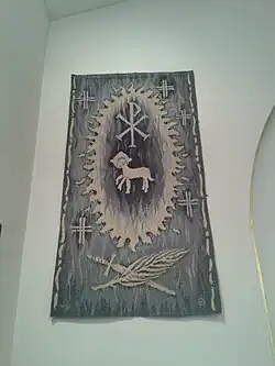 Dans l'église catholique d'Ollon[55], sur le côté gauche du chœur (côté aval), se trouve une tapisserie[56] qui présente plusieurs symboles liés au Christ[57]. Au centre de la tenture, entouré de flammes qui manifestent la divinité de Jésus au même titre qu'une auréole, se trouve le dessin d'un agneau. Ce symbole renvoie à Jésus[58] et a une grande place dans l'iconographie chrétienne. Il est à mettre directement en lien avec Pâques puisque le Christ est présenté comme l'Agneau immolé pour le Salut des hommes[59]. À noter que dans l'église primitive, le Fils de Dieu est aussi présenté comme l'Agneau, le pasteur des croyants[60], un pasteur qui prend soin de la brebis perdue[61] et qui est le bon berger[62].