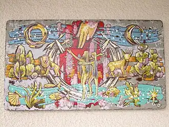 Devant l'église catholique d'Ollon[90], sur le mur gauche (côté aval) à côté de l'entrée, se trouve un émail de 160 x 90 cm qui représente la création du monde et des hommes par Dieu. On y voit la main de Dieu, Dieu créateur, et différents éléments présents dans le premier récit de la création soit : les mers et le ciel créés le deuxième jour[91] ; l'eau et la terre ainsi que la végétation le troisième jour[92] ; les luminaires soit le soleil et la lune créés le quatrième jour[93]; les poissons et les oiseaux le cinquième jour[94] ; les bestiaux, bestioles, les bêtes sauvages et les êtres humains le sixième jour[95].