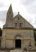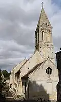 L'église arbore une longue flèche de pierre pyramidale[1].