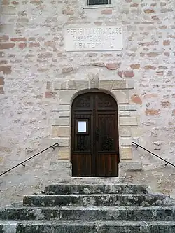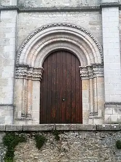 Le portail ouest de l'église, contemporain de la façade, est de style roman, en plein cintre ; son arc comporte trois voussures décorées de tores et de chevrons, reposant sur des chapiteaux[8]. Un escalier accolé à la façade permet d'y accéder. La porte sud de l'église, plus tardive — une inscription laisse penser qu'elle a été percée ou restaurée en 1661 —, est surmontée d'une dalle de pierre gravée de la devise républicaine « REPUBLIQUE FRANÇAISE - LIBERTE-EGALITE-FRATERNITE ». Cette dalle a remplacé en 1983 une plaque métallique portant la même inscription et posée vers 1906, après l'entrée en vigueur de la loi de séparation des Églises et de l'État.
