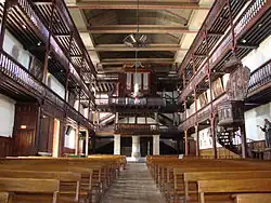 Les trois étages de galeries sont aussi l’une des spécificités des églises du Labourd. Ces galeries à l’origine réservées aux hommes sont encore en 2011 utilisées en cas d’affluence dans l’église. Elles se situent sur les côtés nord-sud-ouest de l’église. Les deux séries de galeries latérales mesurent 23,30 m de long sur 1,35 m de large[13]. Elles font partie de la charpente générale de l’église visible aussi dans la nef de 27,68 m sur 12,85 m[5], une charpente typique des églises du Labourd construites par des charpentiers de marine.