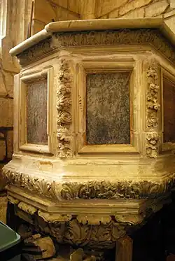 - La chaire était installée dans la nef, mais, lors de la restauration en 1967, la vieille chaire fut démontée et ses divers éléments dispersés pour une part dans le petit jardin de curé derrière l'abside romane et d’autre part dans des locaux du cimetière. Certains éléments furent même employés comme décorations tombales. En 2010, à l’occasion des journées du patrimoine, l’association A.S.V.P.F. a retrouvé et réuni tous les éléments de la chaire et a reconstruit une partie de cette dernière pour l’exposer aux visiteurs. Elle est toujours visible, protégée derrière les grilles des anciens fonts baptismaux.