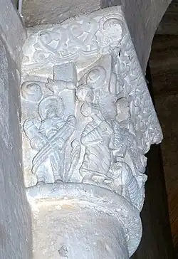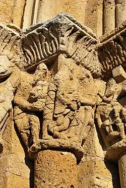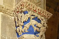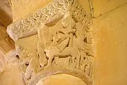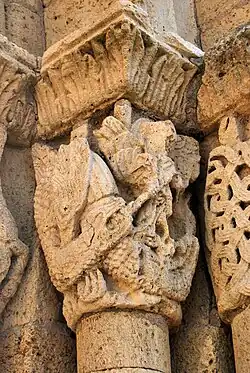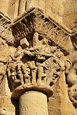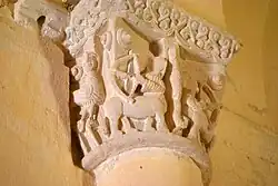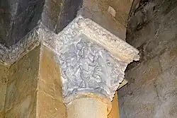 Le chapiteau ouest du pilier possède une corbeille ornée de simples feuilles d'acanthe. Le chapiteau à l'entrée du presbytérium est plutôt énigmatique. Léo Drouyn[3] a proposé l’interprétation suivante, tirée du Premier livre des Rois (chapitre XIX, versets 3-9) : « le prophète Élie endormi sous le genièvre et nourri par l'ange avec galette chaude et cruche d'eau », dont le récit biblique a le mérite de correspondre, en grande partie, aux personnages de la sculpture.
