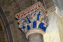 Les colonnettes les deux sculptures nord et sud sont des œuvres ordinaires. Les tailloirs des chapiteaux sont ornés de rinceaux sur un seul côté, car la face interne a été découpée lors du montage de l'arc.