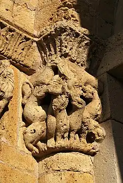 Dans certains guides touristiques, ce chapiteau est abusivement décrit comme représentant Daniel entre les lions, un thème populaire dans la région. Quand la représentation d'un homme avec des lions fait référence à l'un des deux récits bibliques de Daniel dans la fosse aux lions, on trouve toujours soit un ange, soit le petit prophète Habacuc (Livre de Daniel, chapitre XIV, v. 36) et les lions ont la gueule fermée (comme à l'église de Saint-Quentin-de-Baron). Par contre des représentations caricaturales, comme ici et dans le sanctuaire de l'église de Doulezon — qui d'ailleurs, possède un véritable Daniel aux lions sur un chapiteau du portail —, sont assez nombreuses. Elles illustrent l’hypocrisie du faux prêcheur mais vrai pécheur, qui tente de servir deux maîtres : Dieu et le démon de la chair. Le même thème se retrouve sur l'un des chapiteaux de l'intérieur de l'église. Ce sont des édifications morales, à l'intention des pèlerins de passage, sur le chemin de Compostelle.