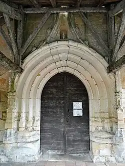 Le portail est du XVe siècle avec colonnettes moulurées réunies, formant quatre arcs séparés. Au-dessus, une accolade retombant sur deux colonnes droites terminées par des choux frisés formant un encadrement. Un hangar protège l'entrée de l'église.