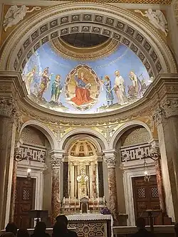 L'hypothèse[12] que des éléments en maçonnerie de l'ancienne église ont été conservés dans le nouvel ensemble (les bâtiments plus la nouvelle église) est fondée. L'emplacement de l'ancienne abside coïnciderait avec l'actuelle chapelle de la Sainte Vierge. Des considérations à l'appui de cette hypothèse concernent la forme de la nouvelle église. La persistance de la structure maçonnée de l'abside, avec ses proportions, en aurait affecté le plan et le développement en élévation. La rotation de 90° de l'axe de l'église (nécessaire pour l'obtention d'un bâtiment plus petit dans le même lot), aurait exigé la construction d'une chapelle symétrique et grande d'autant.