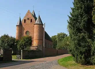 Le chevet, entièrement plat, est flanqué de deux tours cylindriques percées de meurtrières, dont l'une est tronquée. Au sommet, l'étage fortifié possède trois ouvertures.