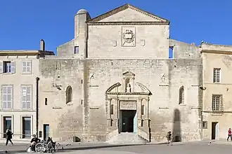La façade principale, ouvrant à l'est, face à Saint-Trophime, est très sobre ; sous le fronton triangulaire surbaissé à corniche à modillons, on peut remarquer deux blasons, martelés à la Révolution, qui portaient l'un les armes de France (Louis XIII ayant, lors de sa visite à Arles le , fait un don de 15 000 livres pour sa reconstruction), l'autre les armes de la Ville ; au-dessus du portail d'entrée un niche abritait une statue de la Vierge remplacée par un buste de Minerve lors de l'instauration du musée lapidaire.