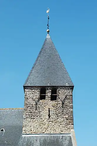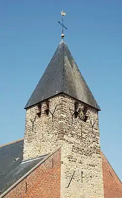 La tour est coiffée d'une flèche pyramidale à couverture d'ardoises.