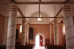 L'église est de style roman. Elle comporte une nef et deux collatéraux de trois travées, qui se terminent par une abside et deux absidioles ; il n'y a pas de transept.