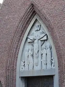 L'église de briques présente une voûte à vaisseau renversé et un clocher (béni en 1956) s'élève à gauche de la façade, tandis qu'une petite tourelle aveugle à droite est surmontée d'une flèche de pierre. La façade est éclairée dans sa partie basse de deux paires de fenêtres ogivales. Le tympan ogival est orné d'un grand bas-relief de la scène de la Crucixion en pierre.