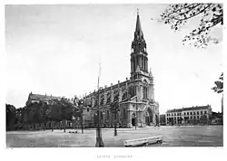 À la mort du père Dartigues (en 1861), c'est le père Merley qui reprend en main le chantier, définissant ses limites (les rues M.A. Petit, Ravat et des Échevins, ce qui correspond à une superficie de 750 m2 tout compris). Le style retenu est néogothique[4] et c'est l'architecte Clair Tisseur, également connu pour avoir réalisé la même année les plans de l'église du bon Pasteur, qui est choisi, alors que l'entrepreneur de maçonnerie est M. Roucheton. La forme retenue est celle d'une flèche octogonale sur tour carrée.