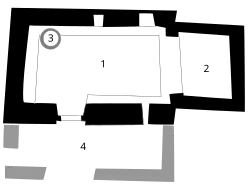 1. Nef – 2. Chevet – 3. Cuve baptismale – 4. Porche.