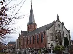 L'église est en brique pour la plus grande partie. La façade, les chœurs latéraux et la sacristie sont en grès.