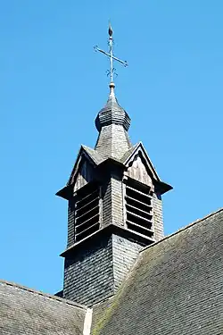 La croisée du transept est surmontée d'une petite tour entièrement couverte d'ardoises comprenant quatre baies à abat-sons surmontées d'une minuscule flèche à bulbe.