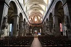 Statues sur les piliers et chaire offerte par Napoléon III. Maître autel en marbre.