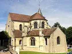 La partie la plus intéressante reste le chevet, par ailleurs bien mis en valeur et dégagé d'autres bâtiments. L'organisation intérieure ressort clairement grâce à l'étagement des toitures. Les fenêtres hautes de l'abside possèdent la même décoration qu'à l'intérieur, c'est-à-dire une archivolte torique reposant sur deux fines colonnettes à chapiteaux. Par contre, les fenêtres sont dépourvues de seuil, et le larmier inférieur s'interrompt en dessous de chaque fenêtre. En haut, le mur est couronné par une corniche en pointe-de-diamant. Les trumeaux des fenêtres sont subdivisés en deux parties par des contreforts peu saillants, qui se retraitent en dessous du larmier déjà mentionné, et qui se terminent par un glacis. Fait assez rare, ils sont décorés d'une corbeille de chapiteau de feuillages et d'une astragale directement en dessous du glacis terminal. Ce décor est exactement aligné sur les chapiteaux à côté des fenêtres. Les quatre arcs-boutants à simple volée s'insèrent dans les contreforts. Les deux contreforts du nord sont entièrement recouverts par un chaperon et ont été refaits en 1898 en reproduisant la physionomie d'origine, du milieu du XIIe siècle. Au sud, les deux contreforts flamboyants de la première moitié du XVIe siècle sont nettement plus hauts et arrivent jusqu'en dessous des chapiteaux. De petits animaux fantastiques peuplent ces arcs-boutants, ainsi que les chaperons de leurs culées ; ils s'apparentent à des hermines. Un pinacle occupe la partie antérieure de la culée, décoré d'accolades plaquées, et se terminant par une flèche garnie de bourgeons et amortie par un fleuron. Au niveau du rez-de-chaussée, le motif de la corniche évoque la frise à l'intérieur de la même travée. L'archivolte de la fenêtre Renaissance est garni de trois tout petits chérubins nus, le quatrième à gauche a été bûché. Ainsi, la partie sud-est du chevet présente une cohabitation de trois styles architecturaux - gothique primitif, gothique flamboyant et Renaissance, qui ne soulève pour autant aucun problème esthétique. La travée sud du déambulatoire se cache derrière la sacristie, et la travée orientale est précédée par la chapelle d'axe qui n'affiche aucun style particulier. Son décor se résume en une croix en antéfixe[21],[22].