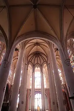 Après l'incendie du 25 juillet 1525, le chœur[m 10] est construit sur un plan classique. C'est cependant la partie la plus remarquable de l'église : les vaisseaux y sont traités dans le mode église-halle avec le vaisseau central, les collatéraux et le déambulatoire — ici très élancés — de la même hauteur ; un point commun avec les églises gothiques du sud-ouest de la France, certaines églises italiennes ou les Hallen-Kirche allemandes datant du gothique tardif[3].
