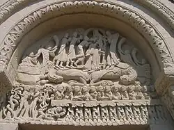 La partie droite du linteau est occupé par la Cène, dernier repas de Jésus entouré du collège apostolique ici au complet. Mais c'est une iconographie double puisque la Cène a été ajouté un éléments emprunté au repas chez Simon relaté en l'évangile selon Luc, 7, 36-50) où Marie-Madeleine, patronne de l'église, s'agenouillant pour laver les pieds du Christ, les essuyant avec ses cheveux[5].