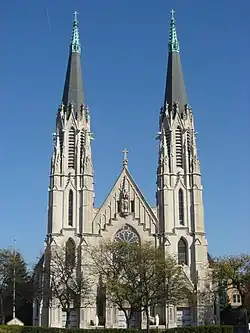 Le RP Brandt arrive en 1856 de Vincennes pour s'occuper de la communauté d'émigrants germanophones installée récemment à Indianapolis. Une première église consacrée à la Vierge Marie est construite deux ans plus tard. Le culte est célébré en latin, comme partout à l'époque, et les sermons et chants en allemand, dans la pure tradition de l'Ancien Monde. La paroisse déménage au coin de la Vermont Street et de la Jersey Street au début du XXe siècle, bâtissant l'église actuelle entre 1910 et 1912 dans le style néogothique inspiré de la cathédrale de Cologne, ville natale de l'architecte, Hermann Gaul. Ainsi des gargouilles décorent, la façade, le porche et les tours.