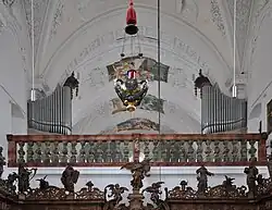 Sur la paroi de la tribune se trouvent, entre les fresques, deux blocs de grès armoriés. Le plus méridional porte l’inscription latine Chorum istu(m) et altare nobil(e) et valid(um) Georgi(us) Gossenprait de Hohenfreiperg et Radgunda Eggen(n)bergeri(n) uxor ei(us) fundaverunt An(n)o d(omi)ni 15(12)[15]. L’autre montre les armes des comtes Waldbott von Bassenheim et les mots Sub comitibus de Waldbott-Bassenheim MDCCCVI-MCMXXVI. Ces blocs armoriés se trouvaient initialement sur les autels de la tribune, ils ont été déplacés à cet emplacement en 1956[16].