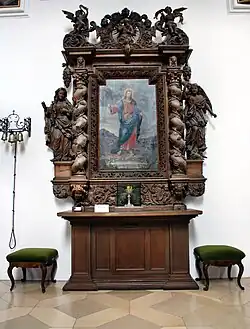 L’autel, en bois brun, comporte quatre niveaux à décor richement doré. Entre deux anges, le tabernacle se présente comme un édicule avec baldaquin et couronne dorée. Par-dessus, un grand retable illustre l’Assomption de Marie, avec son accueil aux cieux et son couronnement par la sainte Trinité. Il est signé «J. G. Bergmiller Aug. Vind, 1718». Ce tableau est précédé, dans la partie inférieure, par un portrait du Christ en Salvator Mundi. De part et d’autre du grand retable, des atlantes portent des colonnes garnies de feuilles de lierre dorées.