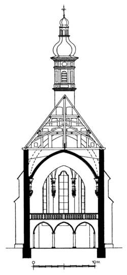 L’église se compose du chœur des moines, du chœur des frères, de la chapelle de Marie et de la sacristie. À l’extérieur, elle comporte des contreforts gothiques. Le promenoir du cloître forme jubé et, à la manière d’un tunnel, sépare le chœur des moines de celui des frères.