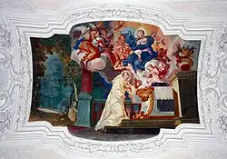 Les trois travées sous la galerie sont ornées chacune d’une fresque. Ces scènes mariales sont du même genre que celles qui ornent les voûtes du jubé. La peinture du centre est accompagnée de quatre emblèmes mariaux également peints à la fresque[* 8].