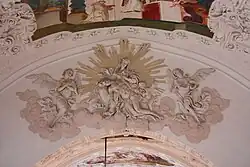 Au-dessus des colonnes, sur les parties arrondies d’un fronton brisé, sont assises les figures de sainte Marie-Madeleine et de sainte Catherine d’Alexandrie. Côté nord, Marie-Madeleine, vêtue d’une robe dorée, porte un voile d’or. Elle tient dans sa main droite un crâne, sans sa gauche un pot de myrrhe. Catherine d’Alexandrie est vêtue d’un habit d’or et de turquoise. Sa main gauche empoigne une épée. Derrière elle se trouve son second attribut, une roue brisée. Entre les deux, sur la console centrale, la Vierge Marie se détache sur une couronne de rayons. Elle est représentée comme une madone sur un croissant de lune et porte un manteau doré, une robe blanche et une couronne, sous laquelle jaillit sa chevelure brune. De la main gauche elle tient l’Enfant Jésus nu, de la droite, un sceptre d’or. L’Enfant Jésus porte dans sa main gauche l’orbe et la croix. L’ensemble est entouré d’anges et de putti.