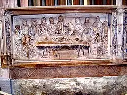- Le bas-relief de l'atelier de Heinrich Brabender (de) (1515) dans le déambulatoire représentant des scènes de la Passion du Christ: au nord, Le Lavement des pieds et La Dernière Cène, au sud, le Christ dans le jardin de Gethsémani et son Arrestation. Dans le cadre de La Dernière Cène, on remarque un symbole de Lübeck qui est aussi familier au folklore allemand. C'est une petite souris qui ronge un rosier, ce qui est signe de bonne chance.